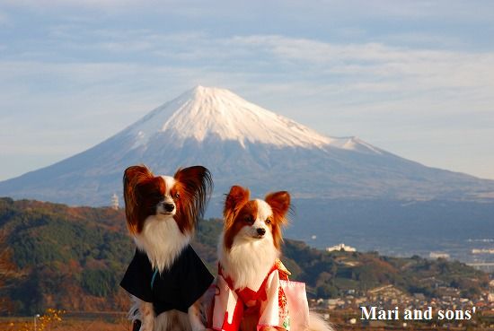 そしてこちらは今年も富士川SAから富士山がとても綺麗に望めましたので かなり寒かったのですが まりと康太にちょっと寒さを我慢してもらい 晴れ着姿で富士山をバックに記念撮影したものです |