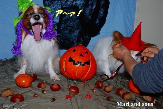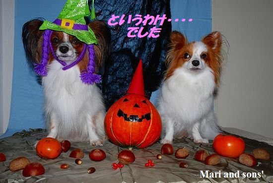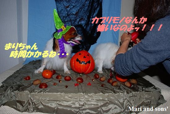 オバアチャンから借りてきた空色と薄茶色の裏地に小物をセットして康太君もカチューシャを被ってカボチャの横で準備完了! |