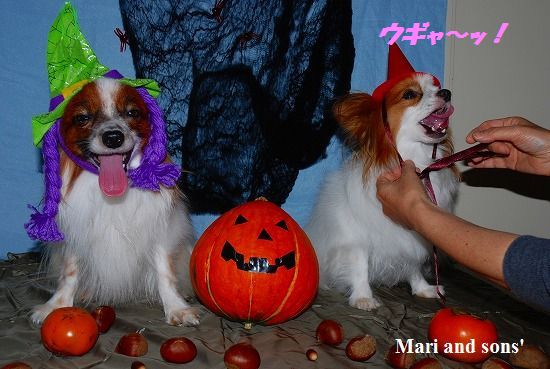 写真撮影の間 いつものようにご馳走を目の前にして待ちきれずにワナワナ震えてしまうまりの笑顔を引き出す為に取り分けていたカボチャのマッシュを少し食べさせたのですが 康太も見ると左目から大粒の涙がポロリ! |