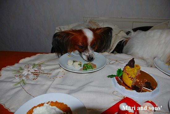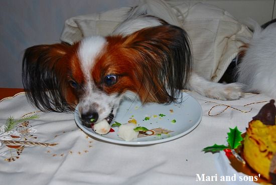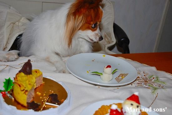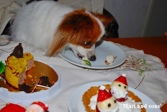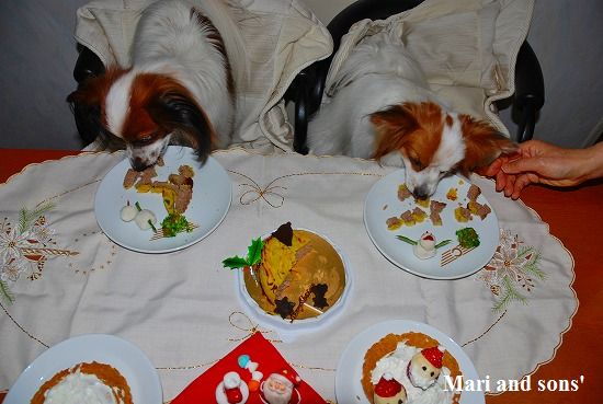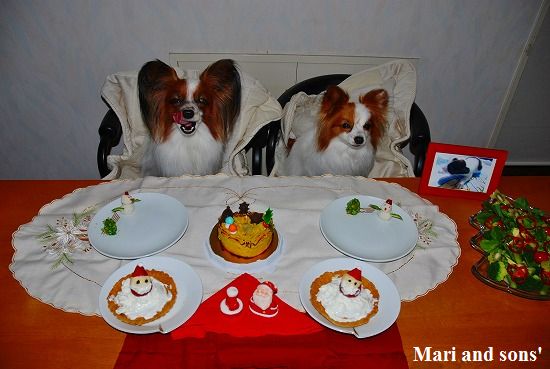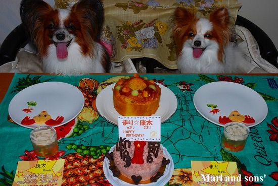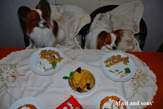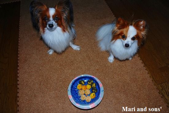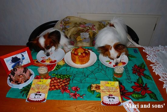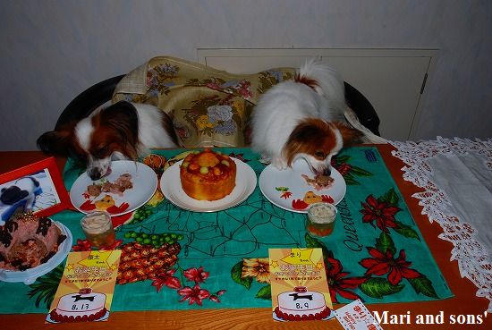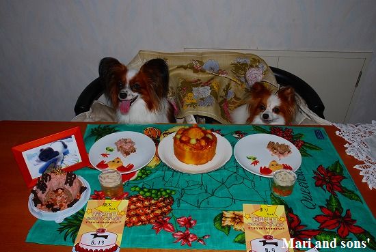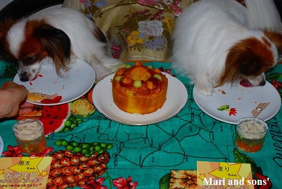 でもまりのお腹が朝から少しゆるかったので 今日は馬肉ケーキにお腹の薬を混ぜて少しだけ食べさせました 大好物で出来た飾りなので勿論二人共ペロっと完食です 自分達の顔などどは思ってもみなかったでしょうが。。。 |