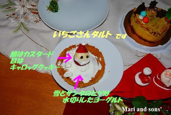 ワンコ用手作り食のサイトで見つけたイチゴタルトを少しアレンジしてお馴染みのクックパッ○で見つけたイチゴサンタさんを乗せました 前日から水切りしておいたヨーグルトを雪とサンタさんのお髭に見立てて キアッケレさんのケーキに付いてきたキャロブクッキーを砕いた物をオメメにして