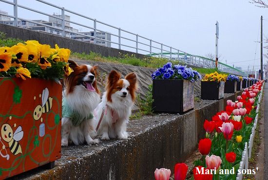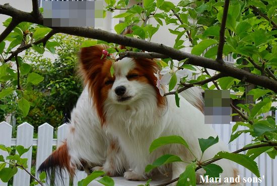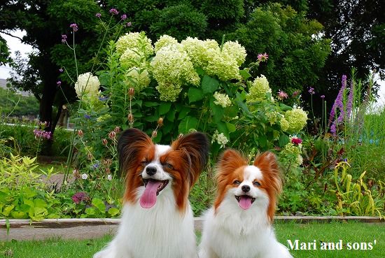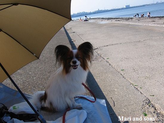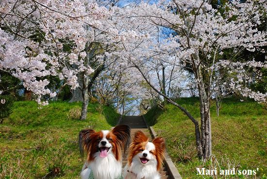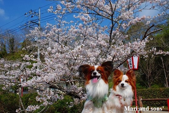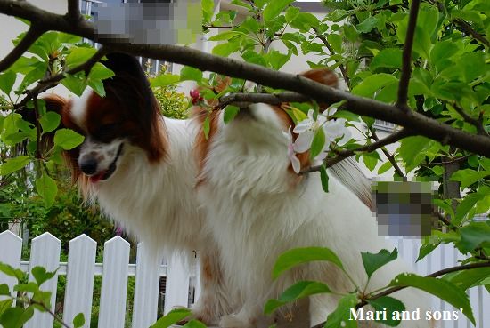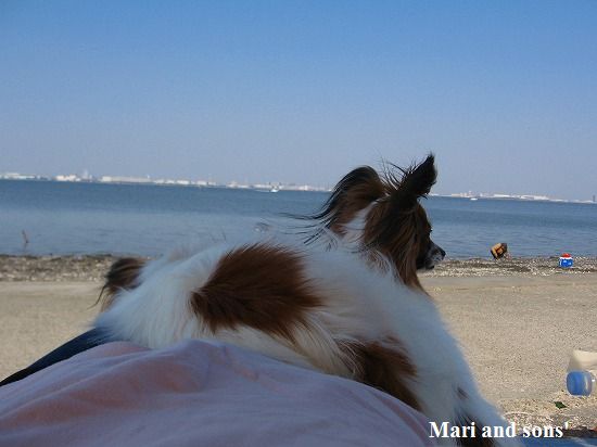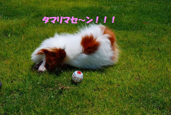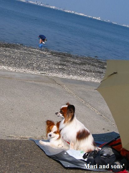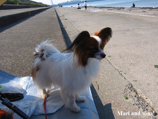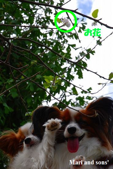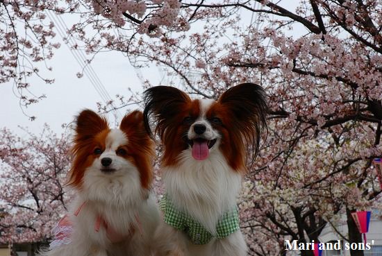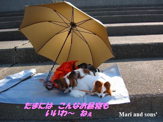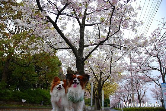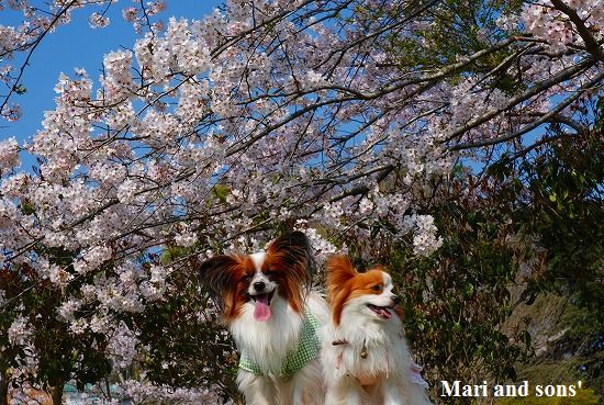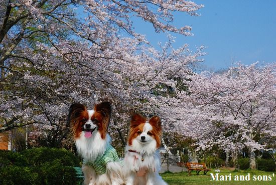 康太は公園の芝生を目の前に「早くボールやらせてよ」と気もそぞろなのですが お花見のお客さん達がいるし ここはボール遊び出来ないんだよ! まりは持って来たオヤツを貰えれば大満足 康太もオヤツを貰ってニコニコです |