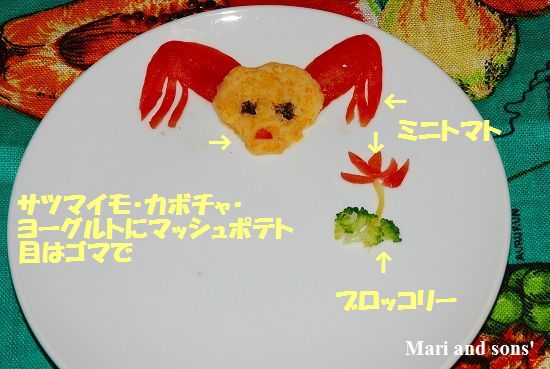 カボチャとサツマイモのマッシュにヨーグルトを混ぜたお団子に きな粉 黒ゴマ 人参の3色でトッピング |