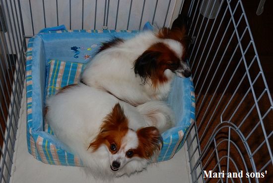 色々な検査の結果 いつもは康太もおかあさんのベッドでまりと3人一緒に寝るのですが この一週間まりが辛そうなので康太は一人でサークルの中に寝てもらいました |