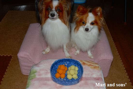 一昨年から恒例のお月見団子 今年はジャガイモとカボチャにそれぞれスキムミルクを混ぜてみました |