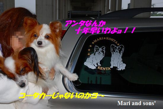ディーラーさんの駐車場で早速はるアートさんに作って貰った オリジナルステッカーを貼って記念写真です 康太は『何でいつまでも まりちゃんカーなのさ!』とご機嫌斜め? |