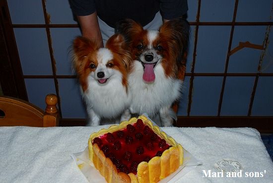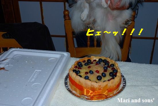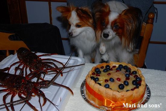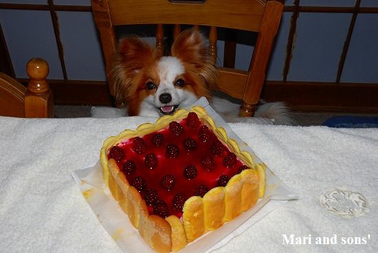 まりと康太がおかあさんの作ったラ・フランスのシャルロットケーキに釘付けになっていると 一緒に記念撮影におさまっていたエビさん達がピョ〜ンっと跳ねて びっくり! |