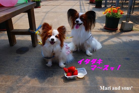 向かった先はさっちゃんの幸せ一杯いちご園さんです 少食で5分程でイチゴ狩りを止めてベンチに戻った叔母さんから美味しいイチゴをお裾分けしてもらってご機嫌のまりと康太です |