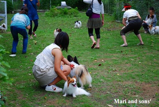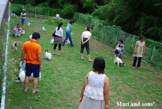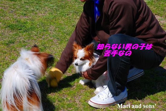 一方まりは ドッグランに入った早々男の子達に取り囲まれてすっかり怖気づいてしまい ずっと叔父さんの膝下に隠れたままでした |