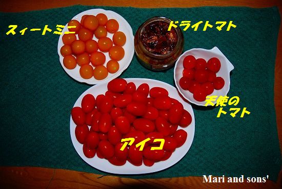 天使のトマトは皮が薄くて甘いですが収穫量は少な目(生るのは生るのですが 採るはしからパクパクしてしまうおかあさんのせいで更に貴重品になってしまうのです) 黄色のスィートミニが3種の中で一番甘いかも? そのせいか去年は付かなかった虫さんがいたりします
