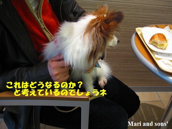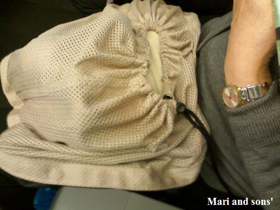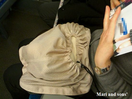 まり達を同伴するには 手荷物料金として二百何十円を支払いますが おっきなバッグはタダなのに・・・・ でも 生き物ですからその分費用が発生するのでしょう 往きは まりが手提げのバッグに入り 康太はスリングでの移動でしたが スリングでは少し自由が利きすぎるようで 私たちが立ち上がると直ぐにそれに反応して動いてしまうので 帰りには反対にして移動しました