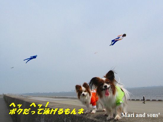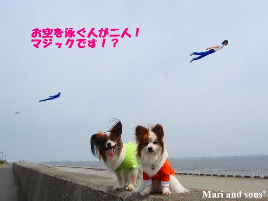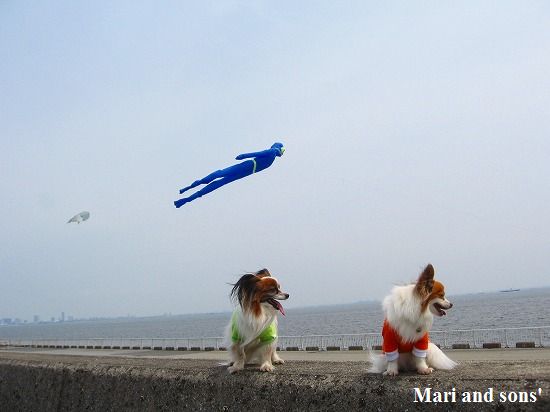 週末にお散歩に出かけて 海岸沿いを歩いていると空に漂うものが!!! 良く見ると 人の形をした吹流し 或いは 凧というのでしょうか でした |