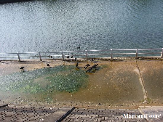 それも 始めの頃は数匹の群れだったのが 二三日の間に増えて これこの通りの群れになって護岸に生えた水草でしょうか を食べているのです |