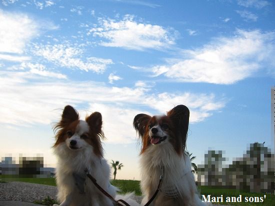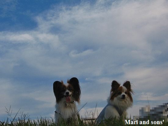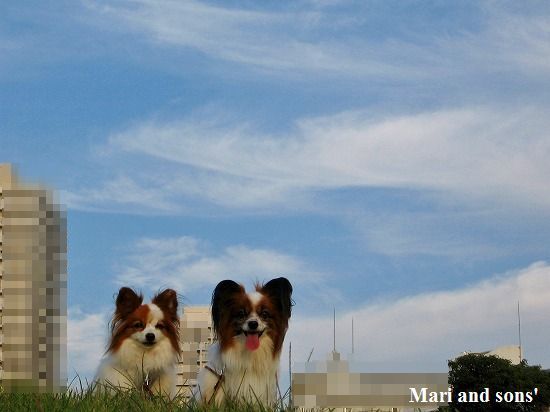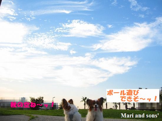 キレイに晴れた空に これまたキレイな刷毛で掃いたような秋の雲が棚引いています 康太はもう原っぱと見れば駆け出したい衝動に駆られるのですが まりは秋の風情を楽しんでくれている!?!?ようです |