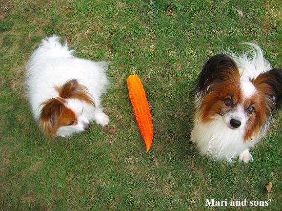 そんな訳で 最後の一玉を食べる前に一緒に記念撮影としたのです まりは 途中からずっと これなんだっけ!? という感じで見ていましたが 康太はそのままでは食べられないと思ったのか興味を失ったようです |