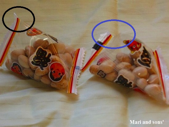 もう一つのトラブルは!!! 我が家はまりがやってきてからというもの 節分の豆まきはパックにされた豆を撒くことにしています これなら周りに散らばらず汚れもしないからなのです それにまり達が咥えても安心だからだったのです そして それが ”だった!!!!” に変わってしまったのです 上の写真を見て お分かりになりますでしょうか? 拡大したものが下です |