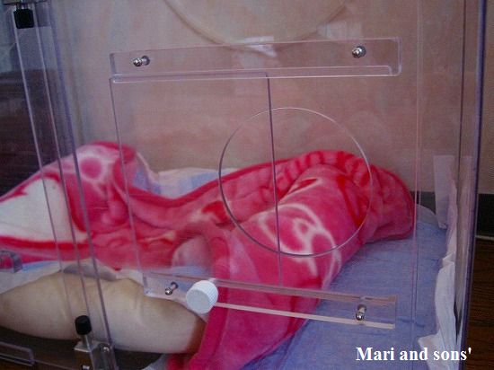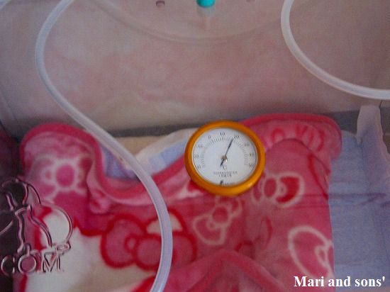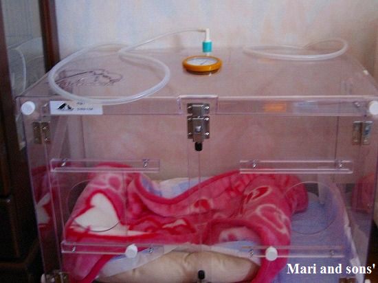 取敢えずの処置として 酸素室に入れて暫く入院しその後精密検査を行うことになりました おかあさんは気が気ではないので この夜はそのまま待合室で待たせてもらうことにしました 結局 まりはこのあと3日病院に留まり回復の気配が見えたこともあり退院しましたが すぐに再び呼吸が荒くなりやむなく再入院となってしまいました 最初は嫌がっていた酸素室ですが やはり呼吸が楽になるからでしょう二度目はそれ程抵抗無くおとなしくしていました |