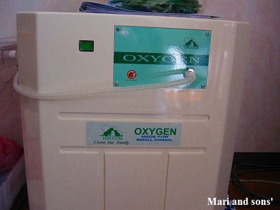 以前は酸素ボンベを利用するタイプだったそうで その際は扱いと交換に手間とお金が懸かったそうですが今では横にあるコンプレッサーで空気中の酸素の濃度を高めアクリルの部屋に送る形になっています 実際 まりが帰宅してから これを利用したのはほんの30分程しかありません もっとも まりが嫌がって落ち着いてくれないことも理由の一つではあるのですが・・・・・ |