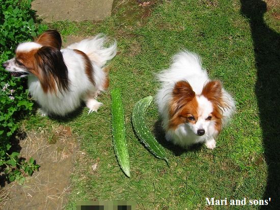 これは 日除けに植えてあるゴーヤが 今年は苗が当たったのか ずいぶんと大きなものが収穫できていますので 二人と背比べしてみた写真です |