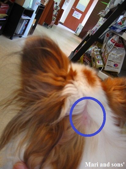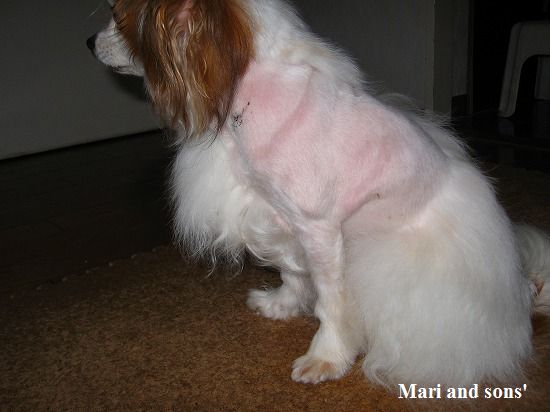まりの 現状の発作 (もうこれは発作と呼ぶべき症状なのだそうです) がおきるのは これが 少しよく見ていただけるでしょう この部分だけ毛を刈り取り 麻酔をかけている間に脊髄から髄液を抜いたのだそうです |