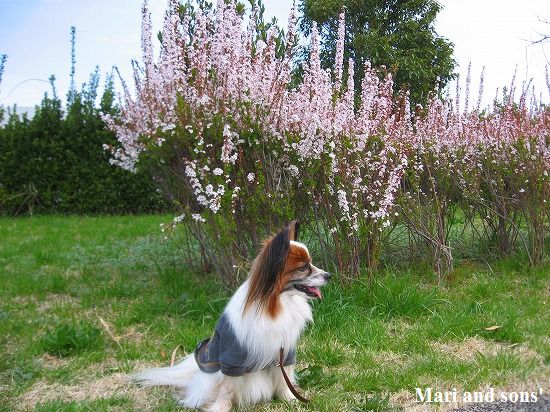 下の写真はこれより少し前にいつものお散歩道の脇に咲いていた 雪柳の花を背景に写したものです |