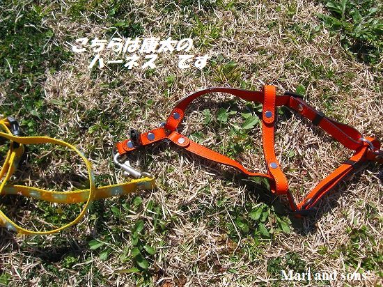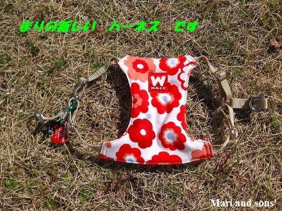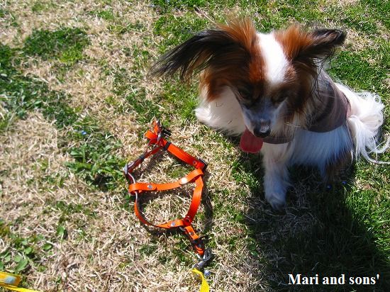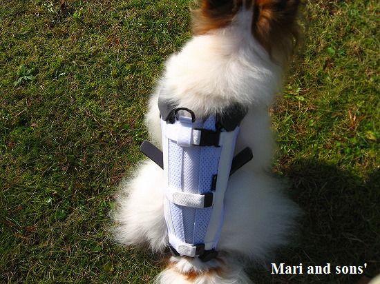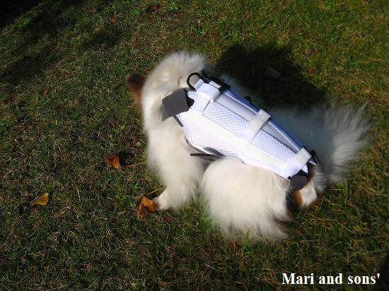 上の写真が次の日に取り付けてお散歩した際に撮ったものです 下は 背中を撮ったものですが ちょっと窮屈に見えます |
