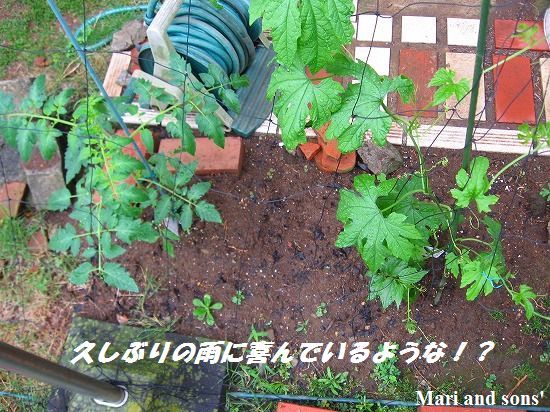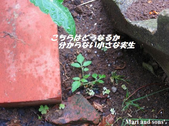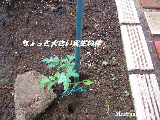 とッ! よく見ると 植えた畝の脇から去年のトマトの落ちた実から発芽したのでしょう 実生のトマトが幾つか発芽していました 以前も発芽しましたが あまり実付きはよくなかった記憶がありますので 期待はしていませんが 残しておくことにしました |