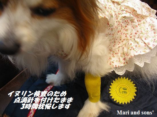 この日の検査では 術前に数値の悪かった腎臓の機能検査を行い イヌリンを注入しその血液における残量から腎機能を図るという検査を行いました 写真で見えるように 前足に点滴用の針をつけたまま3時間ほどを過ごさなければならないのです |