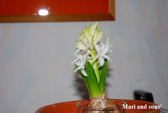今年は 白花のヒヤシンスを選んでみたのですが いくらも葉を伸ばさないうちから花穂を膨らませて もう八分ほど花開いています |