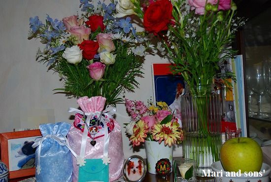 我が家に戻って 買い求めた花々でまりちゃんを飾ってあげました |