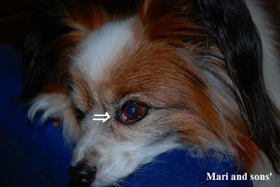さて そんな中 康太もチョット不幸に見舞われたようで 昨年の暮れ頃から 前々から患っていた 所謂”チェリーアイ”の症状の発症の頻度が高まっておりました この症状は 本来はまぶたの下に隠れているはずの瞬膜が目頭から飛び出る というものです 上の写真で 目頭のところに 赤い部分が見ていただけるでしょうか こんな色と形状から サクランボに似ているので チェリーアイ と呼ばれているようです