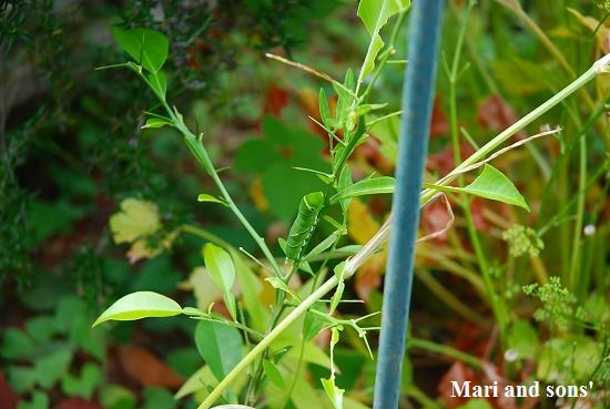 そう それと 春の案内でユズについた蝶の幼虫の話をしましたが あの後いつの間にか 大小取り合わせて5匹程度いたと思いましが 一匹も見えなくなりました |