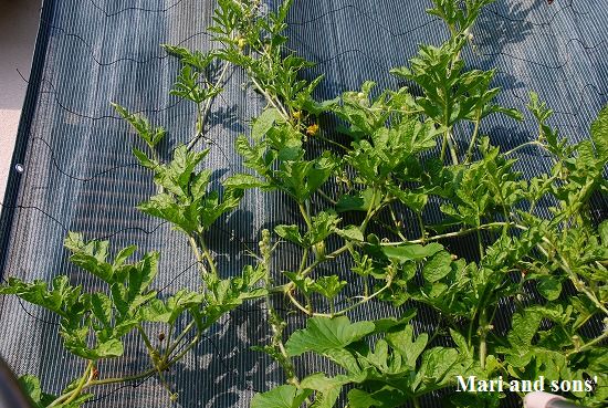 今年の我が家の緑のカーテンは連作障害対策からスイカとメロンを這わせてみたのですが 長雨のせいで成長がわるく梅雨明けから蔓を伸ばし始めたのでほとんど涼やかな感じを与えてくれません |