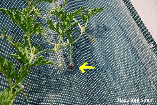 こちらは受粉用に植えておいたこだまスイカですが いつの間にか結実してソフトボール程度に大きくなっていました 今年の野菜果物全体に云える天候の悪影響を感じた次第です |