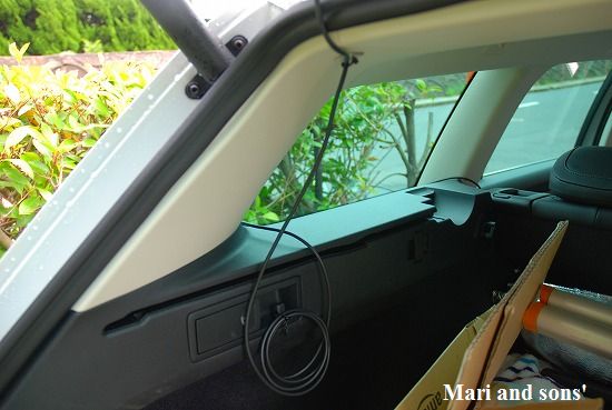 電源は後席のシガーソッケットから取ることにしました シフトギアの脇にもあるのですが ここだと康太が動き回るのに不都合かと思い 配線が一杯イッパイでしたが後ろに回した次第です |