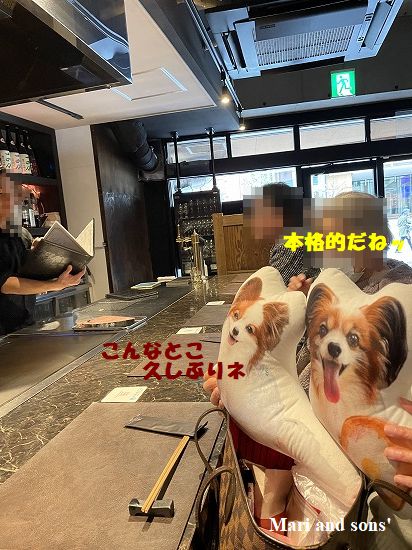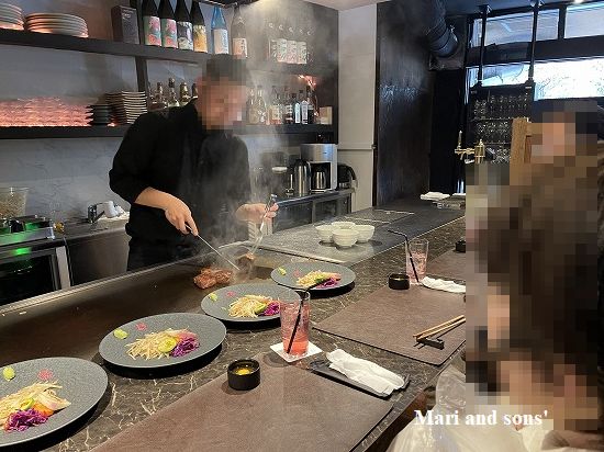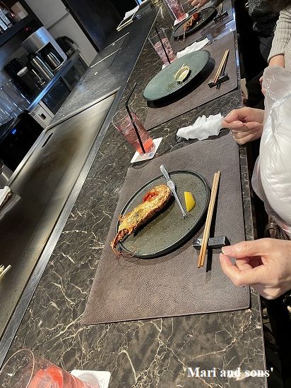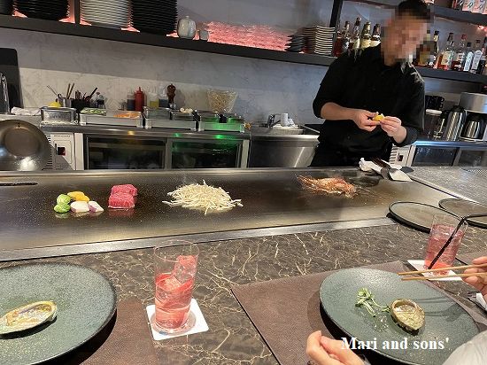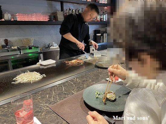 | おばあちゃんも含めて鉄板前の席に陣取ります お昼の時間だったので他のお客さんはおらずゆったりと席を取らせてもらえました まりも康太もこんな席は初めて! なにが来るかな?! |
