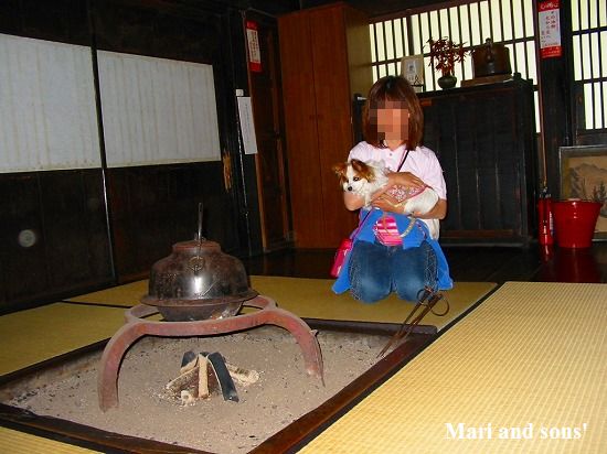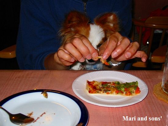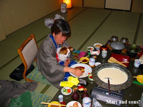 このペンションは食堂へも同伴できるので抱っこで 3人で食事です |
