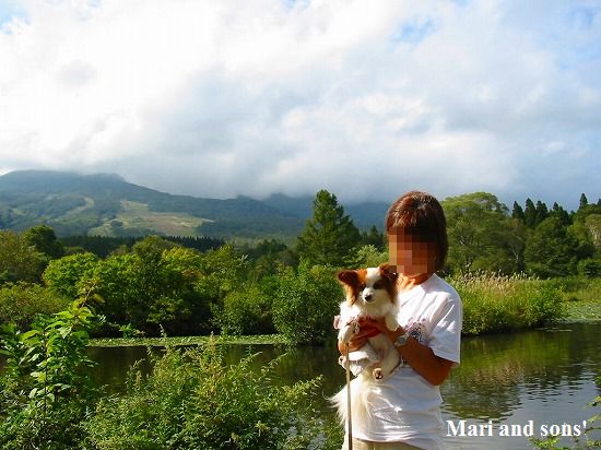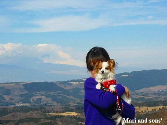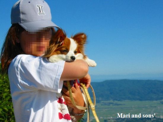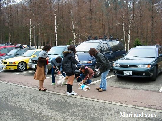 5合目で既に霧が濃く寒かったので まりとお父さん・お母さんは友達がハイキングの間に売店の近くで遊びました 丁度 同じような大きさのパピヨンの子に出会い ご挨拶です |