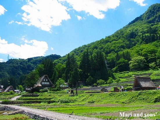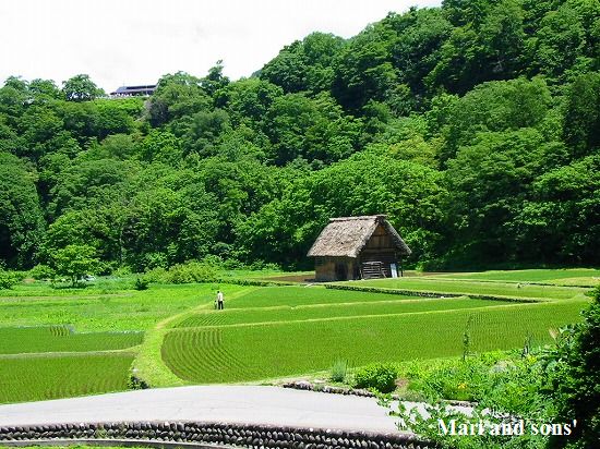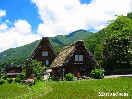 田んぼの緑と茅葺の家屋の風景は子供の時の風景です |