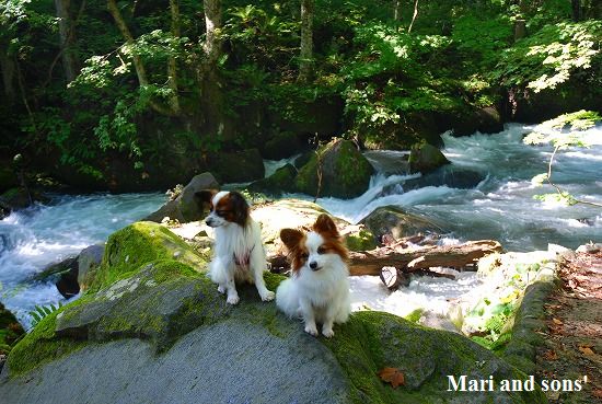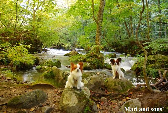 更に車を進めて 奥入瀬渓流中ほどに近い 石ヶ戸の駐車場に車を停め皆で朝御飯をいただきます 朝8時過ぎの気温はさすがに肌寒くお父さんお母さんはジャケットを羽織って出発 まりと康太は探検 探検!と大張り切りです |