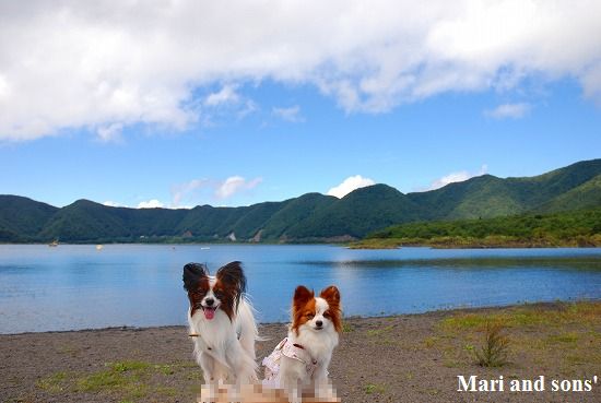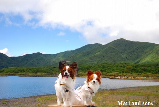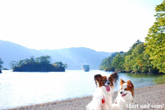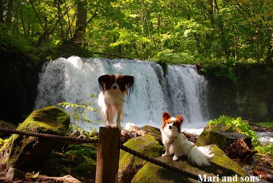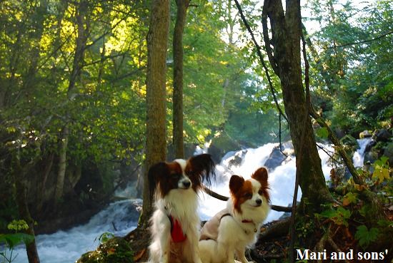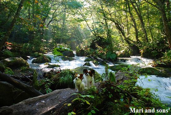 『銚子大滝』に着きました ここは大勢の観光客で賑わっています 十和田湖の子ノ口までは後少しです ゴールが近いと分かったのか まりも 歩く! と張り切りだしました 湖が見えてくると二人とも大はしゃぎ 渓流歩きを頑張った達成感でもあるのでしょうか? |