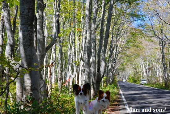 今日も快晴の中 再度奥入瀬上流を抜け 八甲田のドライブルートを通ると 道の両脇が素敵なブナ林のトンネルが現れました ほんとはいけないのでしょうが 車を停めて記念撮影です |