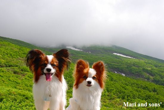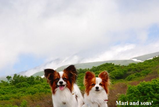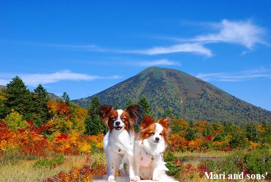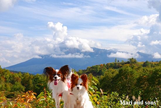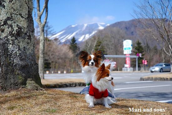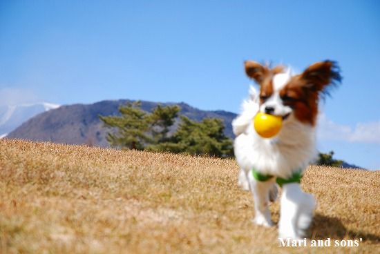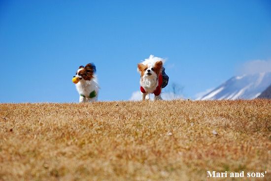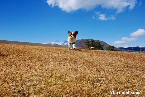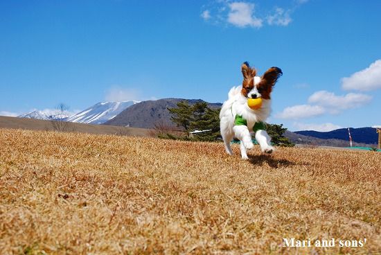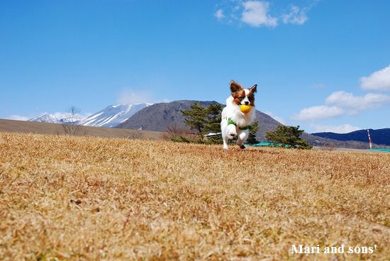 いつものように まりは先ず駆けっこ 康太はキャッチボールです 雪を抱いた浅間山を背景に気持ち良くたっぷり遊べました |