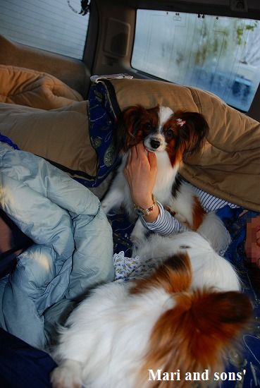 車中泊は10月にしたばかりなのに康太はやっぱり大興奮で 掛けて加えてまりもハシャいで 二人して車の中をピョンピョコ跳ね回ります |