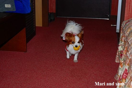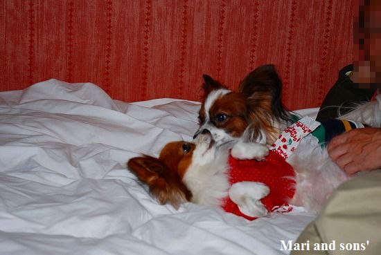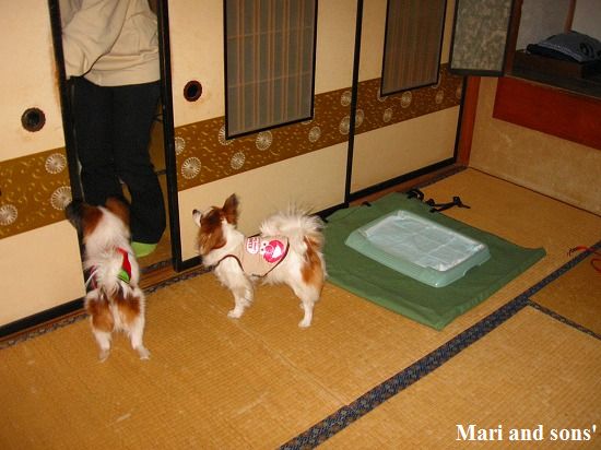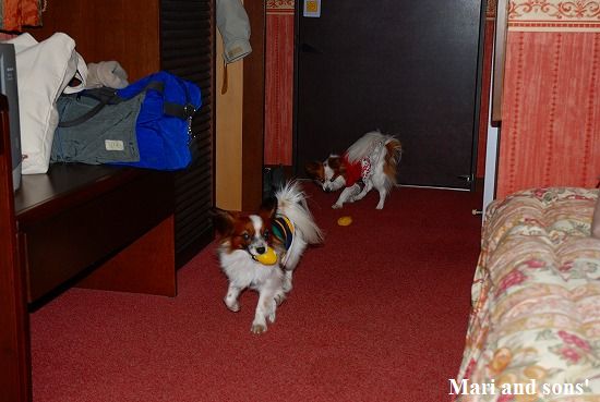 今回のホテルは高山わんわんパラダイスさんです 一頻りオモチャで遊んだ後はベッドに持参のシーツをかけて皆でゴロリと早起きの疲れを解きほぐします |