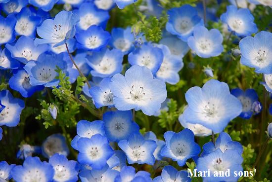 TVで見た水色の正体はネモフィラという花です 放映していた「みはらしの丘」の前後はこの満開の花で一面埋め尽くされていました 大きくなだらかに盛り上がった砂丘の一面に広がっているのでまるでコバルトブルーの南の海のように見えます |