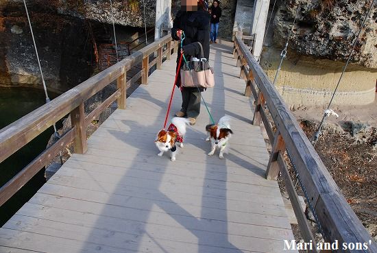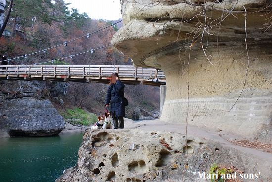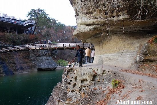 駐車場から下りてゆくと ドライブしながらでも気が付いていましたが そこは狭いながらもさながら”水の豊かなグランドキャニオン”とでもいうものでした 皆で恐々 崖の先から水面を見て 下のえぐれた崖で記念写真です つり橋が揺れてチョット怖かったネ |
