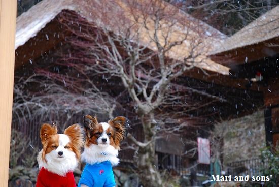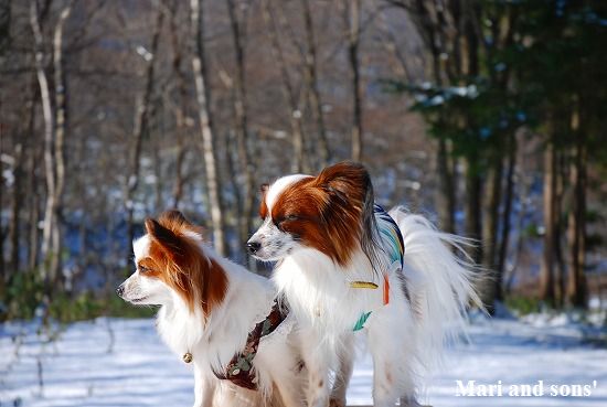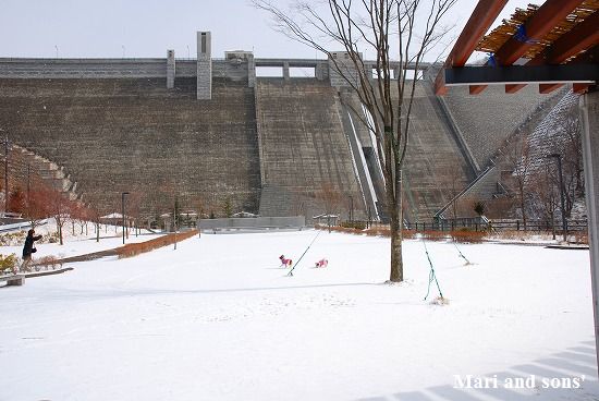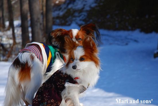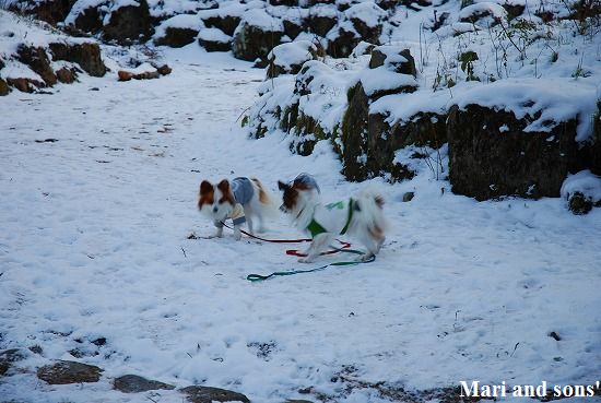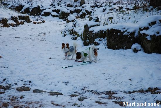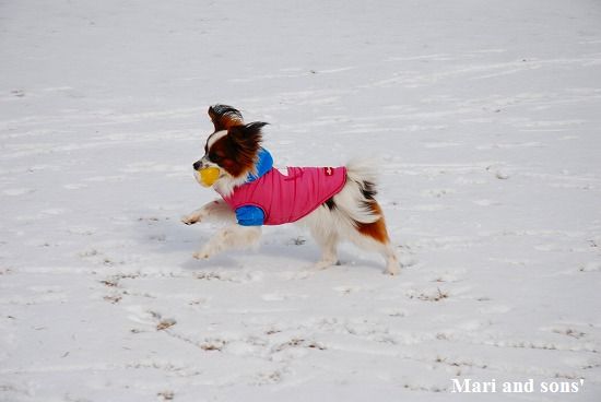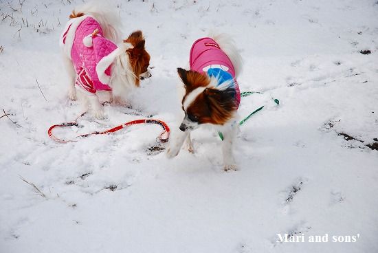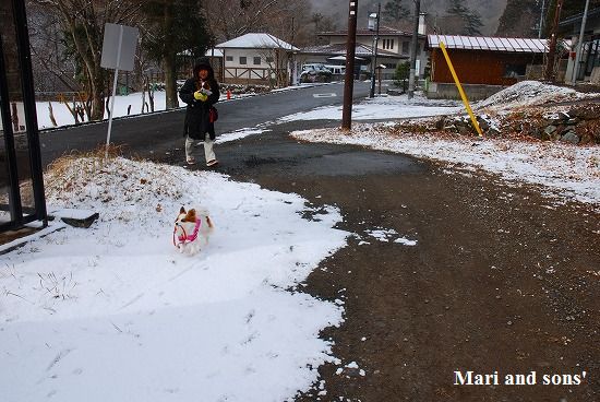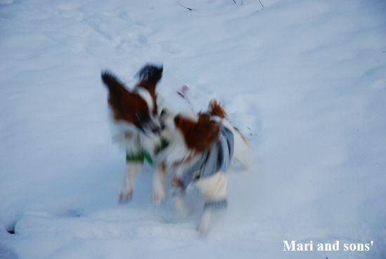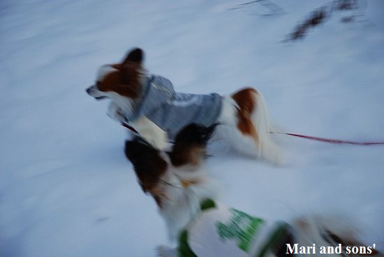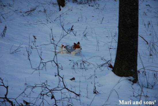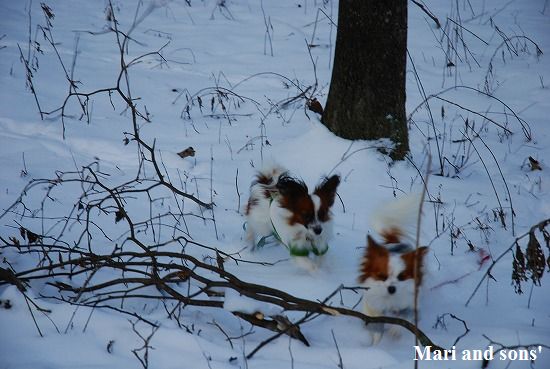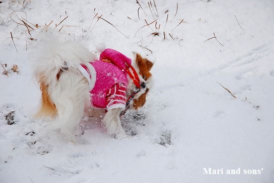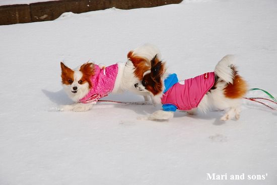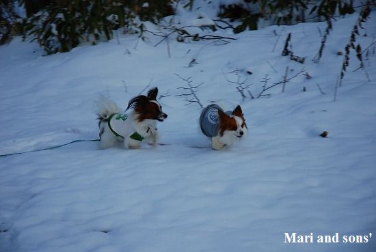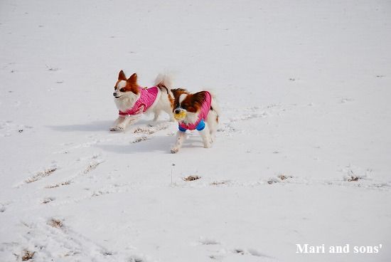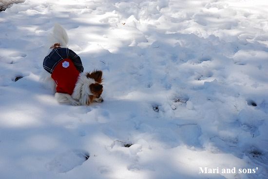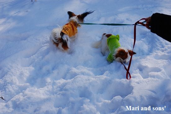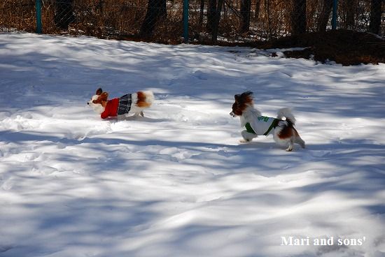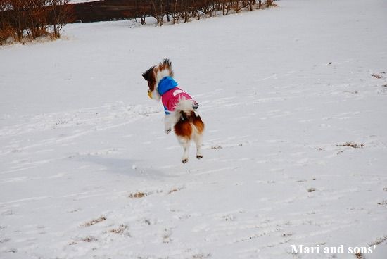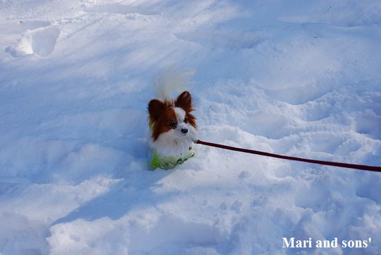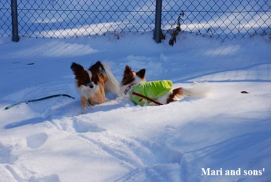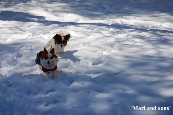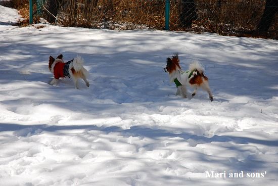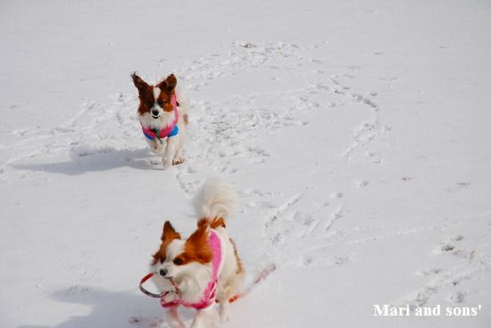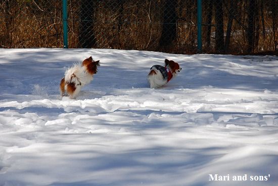 康太には未だ雪遊びの楽しみが判らず 雪の上に降ろしても 冷たーいと思ってるだけのようでしたが 雪大好きのまりが大喜びで走り出すと必死に後を追いかけます