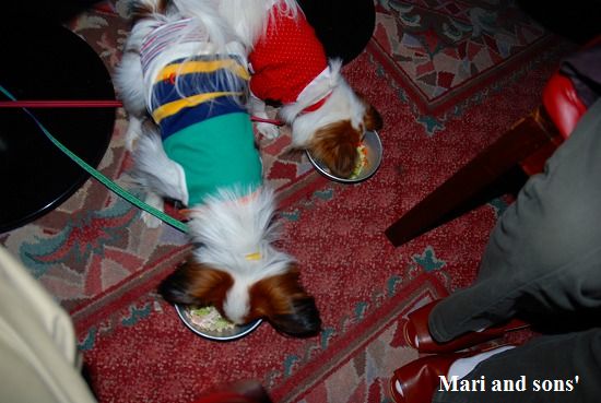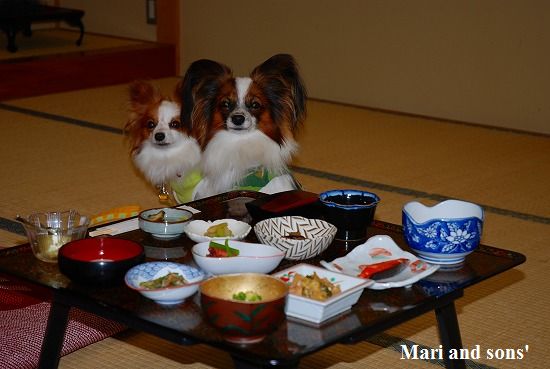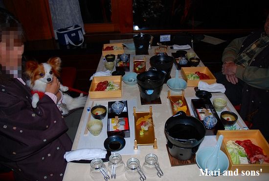 ここでの夕食はまり達同伴で和食です 懐石風に趣向を凝らしたお料理が次々運ばれ とても美味しかったです 飛騨牛の刺身も美味しかったので まり達にも少しお裾分け レストランは窓が大きく取ってあり 外の雪景色と相まって雰囲気がありました でもちょっぴり寒かった |