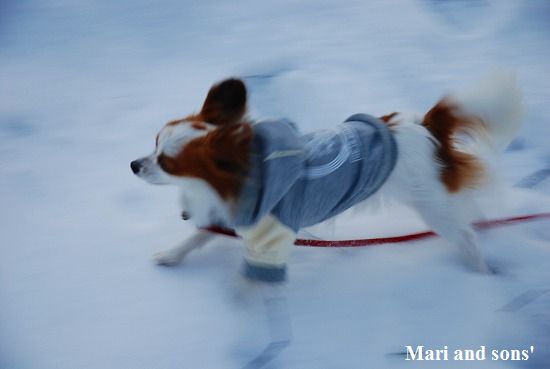 早速お顔を雪に埋めて 雪の白粉を付け駆け回ります 康太もまりが楽しそうに駆けっこをするので これを追いかけます 5分程も夢中で遊んでいたまりが急に立ち止まってしまいました 見るとガタガタ震えています 何とあまりの寒さに震えているのです